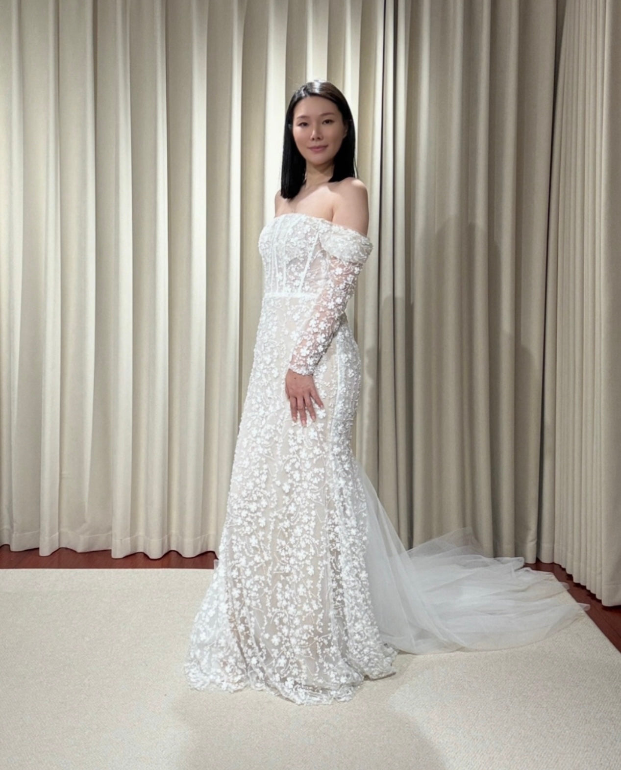 This long sleeve corset mermaid wedding dress with 3D flowers is a custom unique designed dress, suitable for a courthouse wedding dress or other events, it can also be a fairy elopement reception dress for the bride.