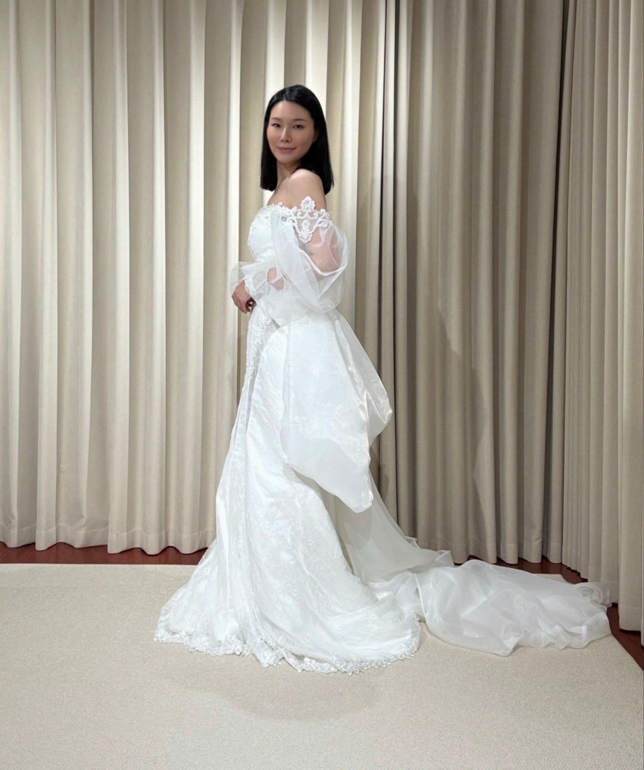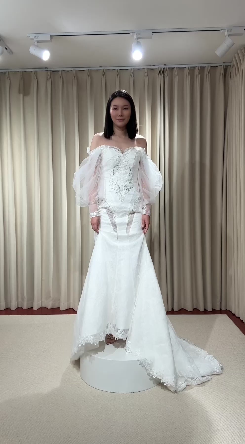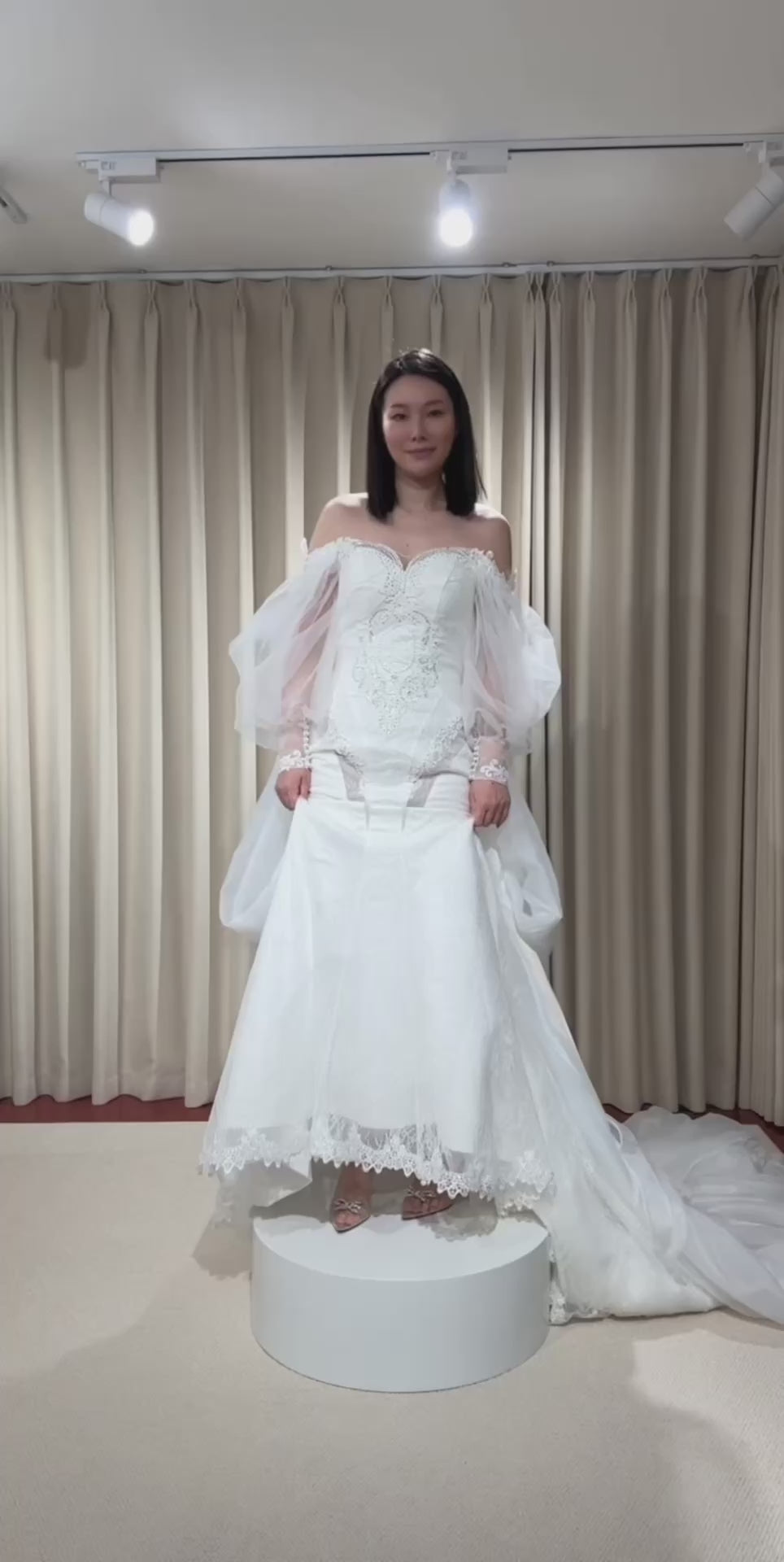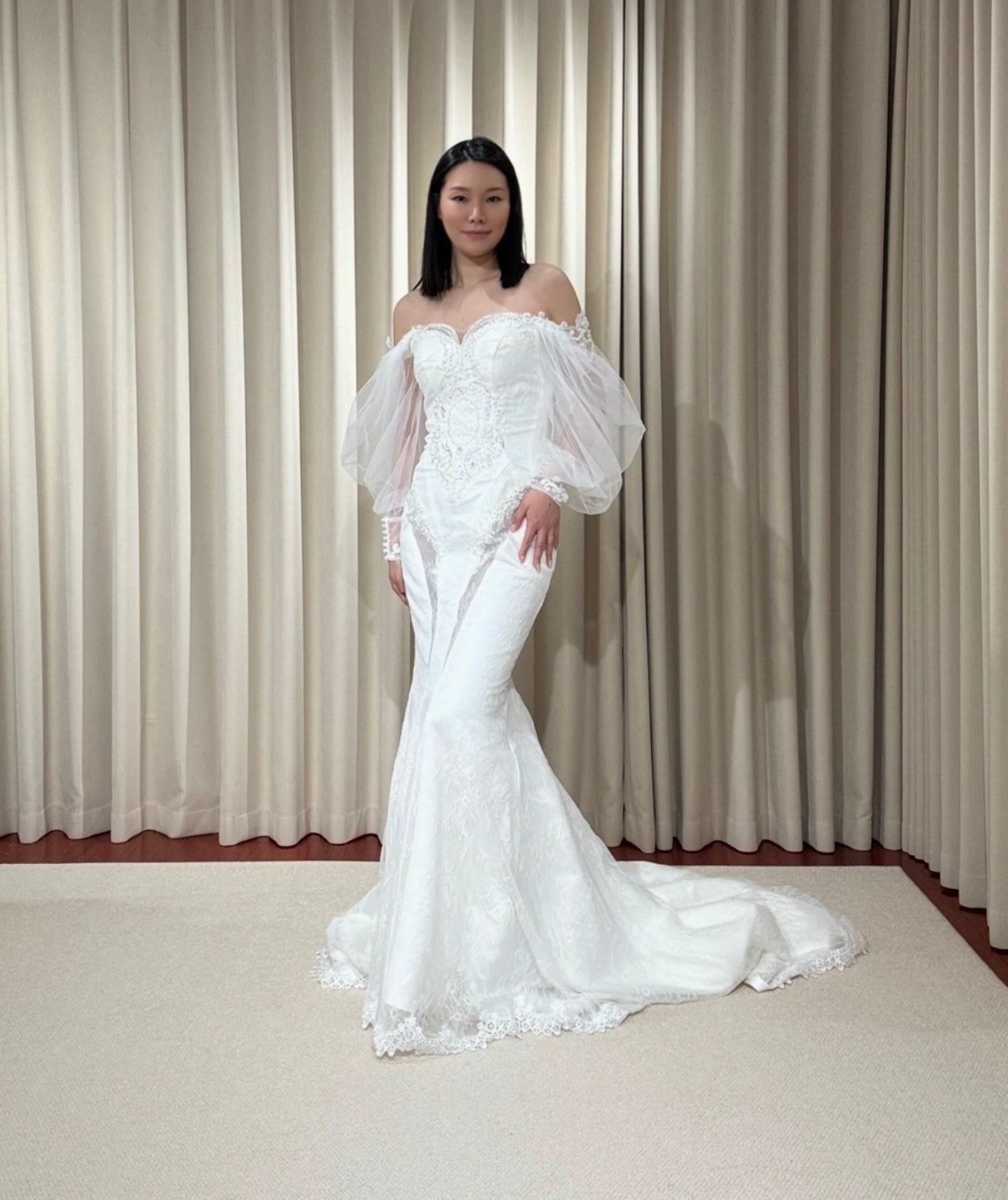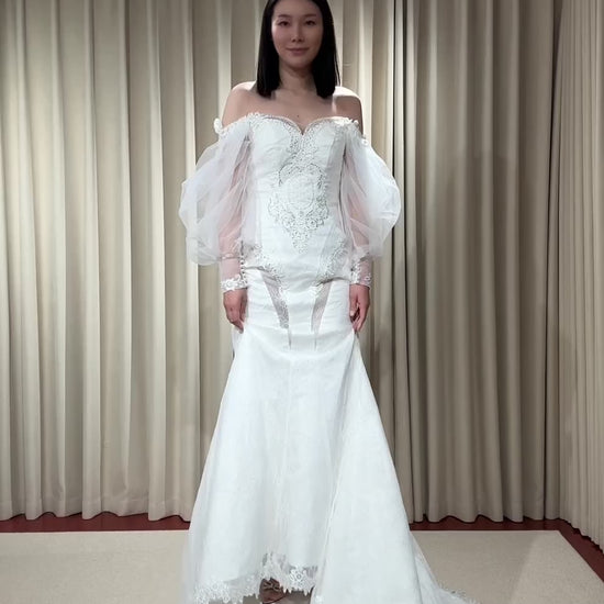 This Long Sleeve Off the Shoulder Lace Mermaid Wedding Dress comes with a detachable Train, the Custom design is unique, suitable for a Courthouse wedding elope dress or a reception dress.